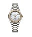 Het horloge heeft een ronde kast met de kenmerkende vijf schroeven, een subtiel maar krachtig stijlelement dat de collectie haar karakter geeft. De parelmoeren wijzerplaat wordt prachtig aangevuld met goudkleurige wijzers en schitterende diamanten in zowel de wijzerplaat als de bezel, met een totaalgewicht van 0,344 ct. Dit zorgt voor een luxueuze, vrouwelijke uitstraling met een verfijnde schittering.