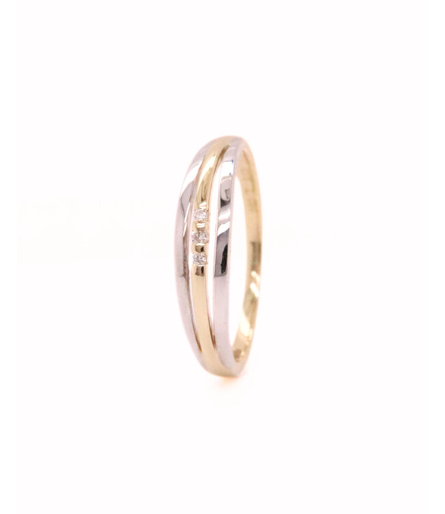 Prachtige wit- met geelgouden ring van het merk Passione. De ring is gemaakt van 14k goud. De ring bestaat uit 14k witgoud en 14k geelgoud, daarom kan de ring mooi worden gecombineerd met andere ringen. In het midden van de ring is een diamanten gezet die mooi zal schitteren in het licht (0.03ct Si). De ring is maat 58, maar kan altijd in uw maat worden besteld.