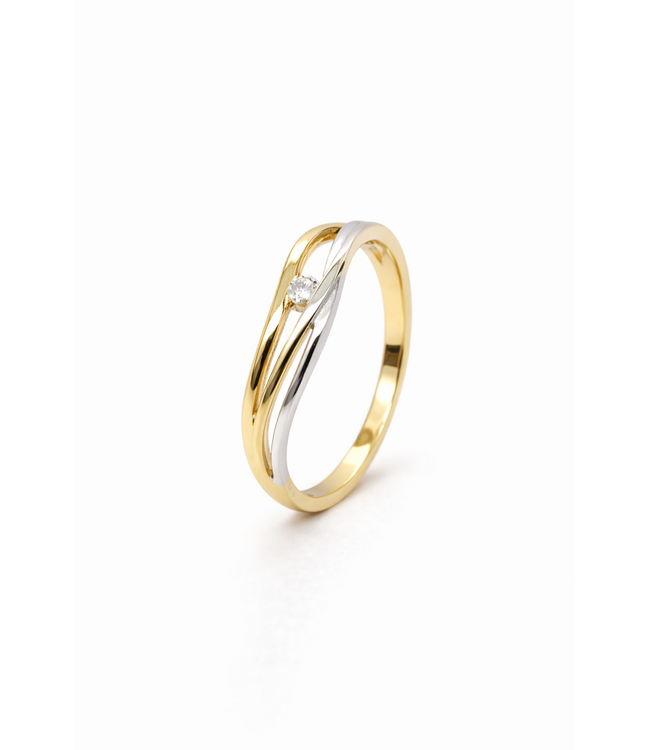 Prachtige wit- met geelgouden ring van het merk Passione. De ring is gemaakt van 14k goud. De ring bestaat uit 14k witgoud en 14k geelgoud, daarom kan de ring mooi worden gecombineerd met andere ringen. In het midden van de ring is een diamanten gezet die mooi zal schitteren in het licht (0.03ct Si). De ring is maat 56, maar kan altijd in uw maat worden besteld.