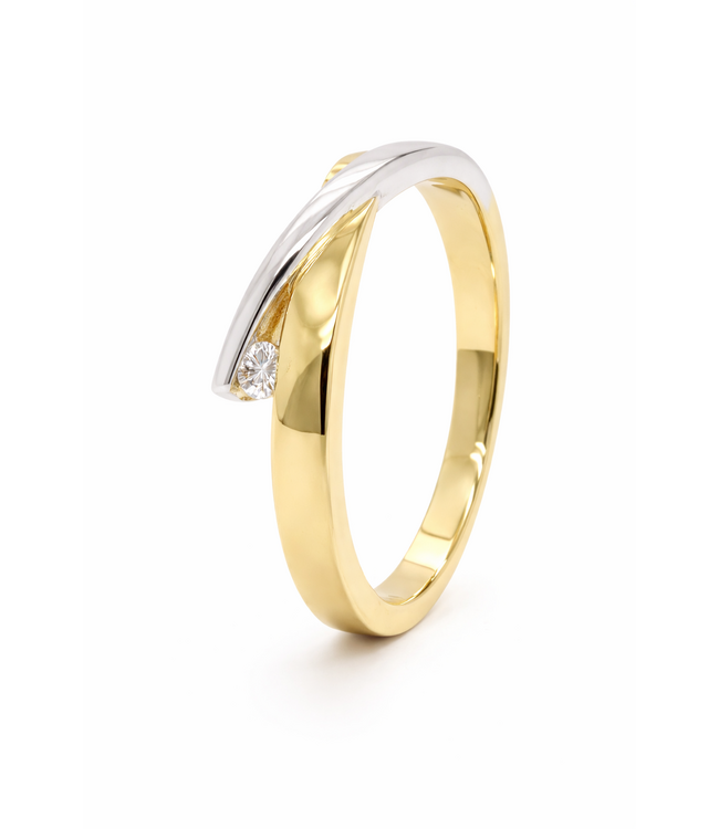Prachtige wit- met geelgouden ring van het merk Passione. De ring is gemaakt van 14k goud. De ring bestaat uit 14k witgoud en 14k geelgoud, daarom kan de ring mooi worden gecombineerd met andere ringen. In het midden van de ring is een diamanten gezet die mooi zal schitteren in het licht (0.03ct Si). De ring is maat 58, maar kan altijd in uw maat worden besteld.