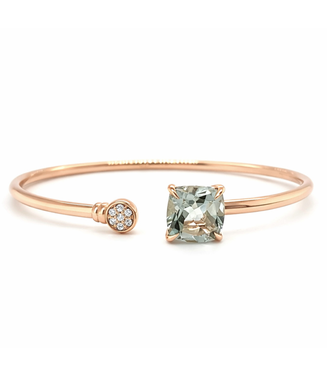 Schitterende bangle van het prachtige Italiaanse merk Positano. De armband is gemaakt van 18kt roségoud. De bangle is bezet met een mooie lichtgroene Praseoliet en briljant geslepen diamanten die mooi zullen schitteren in het licht. Voor meer informatie neem gerust contact met ons op!