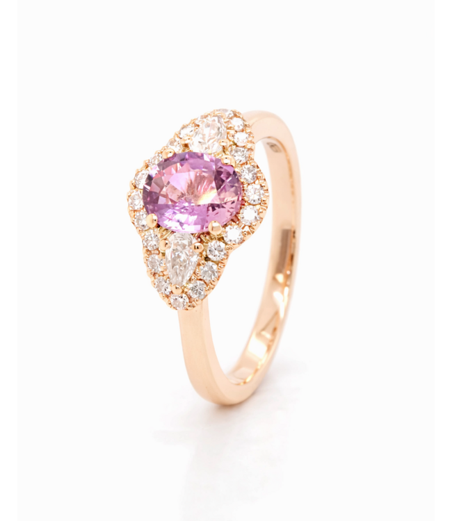 Schitterende 18 karaats roségouden ring van het prachtige Italiaanse merk Positano. Centraal in deze ring een schitterende roze Saffier (1.07ct.) en aan weerzijde 1 peer geslepen diamant, daaromheen briljant geslepen diamanten (totaal 0.40ct.) De ring is maat 54, maar kan op elke maat gemaakt worden.