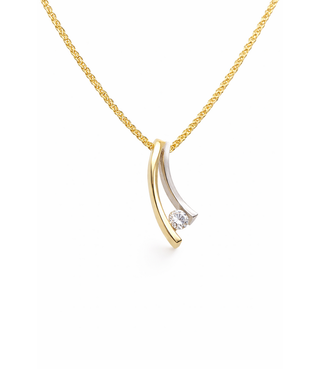 Moderne geel- en witgouden hanger van het merk R&C. De hanger is gemaakt van 14kt goud. Door de combinatie van het geel- en witgoud kan de hanger mooi gecombineerd worden met zowel geel- als witgouden sieraden. De hanger heeft daarnaast ook een briljant geslepen diamant (0.10ct. si/river) die zal zorgen voor een prachtige schittering. Voor meer informatie neem dan gerust contact met ons op!