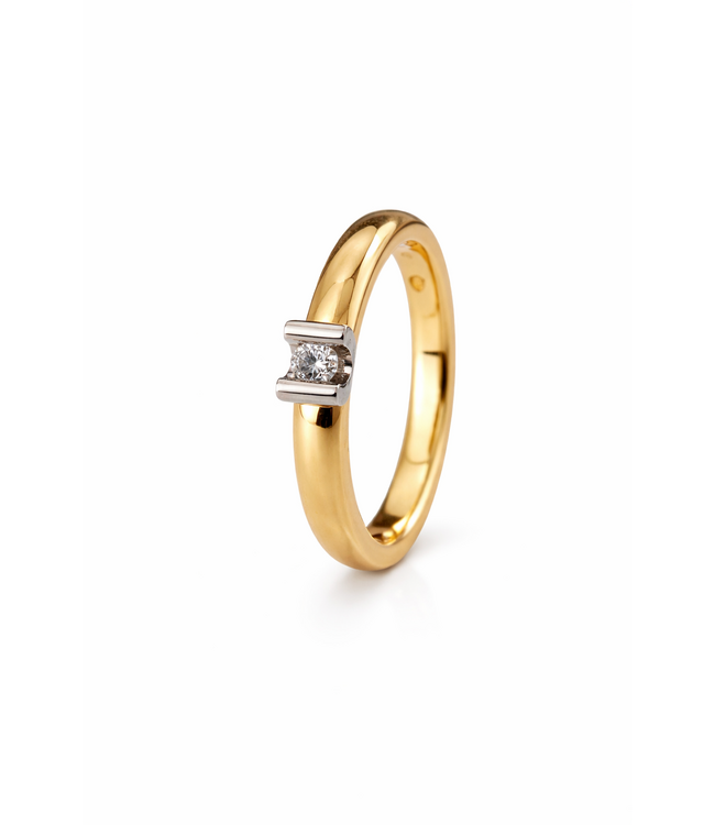 Tijdloze bicolor gouden ring van het Nederlandse merk R&C. De band van de ring is gemaakt van 14kt geelgoud, en de zetting van de diamant is gemaakt van 14kt witgoud. Door de combinatie van de twee kleuren goud, kan de ring goed gecombineerd gedragen worden met zowel geel- als witgouden sieraden. De ring heeft in de het midden van de band een briljant geslepen diamant (0.08ct. si/river). Voor meer informatie neem dan gerust contact met ons op!