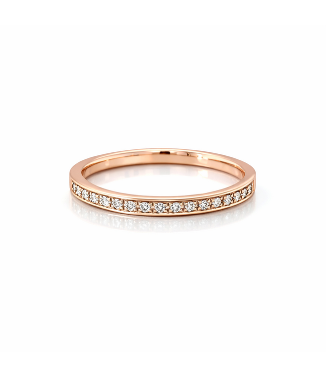 Elegante 14kt roségouden ring met meerdere briljant geslepen diamanten (0.08 ct.). De ring kan gestapeld worden met andere ringen voor een leuk effect. Voor meer informatie neem dan gerust contact met ons op!