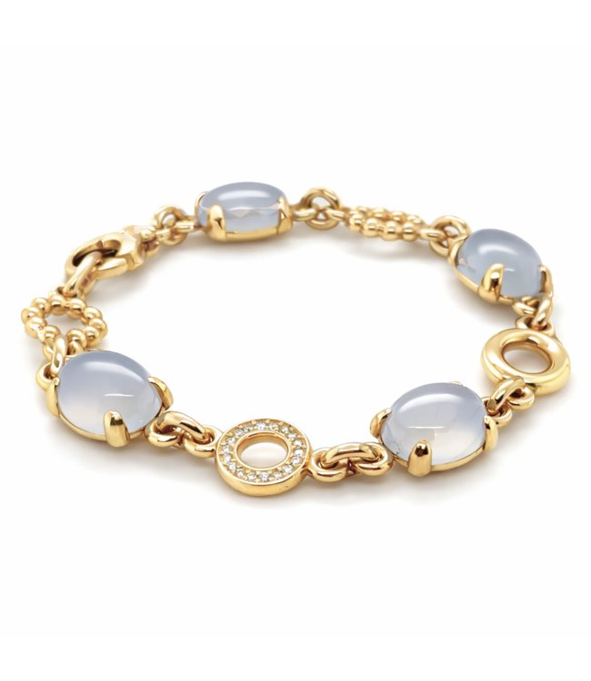 De armband is gemaakt van hoogwaardig 18 karaat geelgoud en voorzien van een zachte, lichtblauwe chalcedoon – een edelsteen die bekendstaat om zijn rustgevende uitstraling en tijdloze schoonheid. Voor extra schittering is de armband bezet met briljant geslepen diamanten (totaal 0.18 ct), die het geheel een subtiele luxe geven.