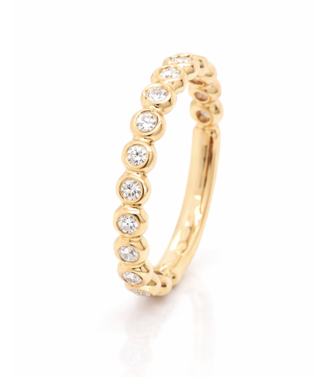 Prachtige ring gemaakt door onze goudsmid Bregje. De ring is gemaakt van 18kt geelgoud en is bezet met 15 diamantjes met een totaal gewicht van 0.33ct TW VS. Daarnaast is het ook een fijne ring om te combineren met andere ringen, waardoor je een unieke ringparty krijgt.