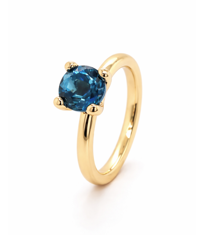 Schitterende geelgouden ring met solitair zetting, ontworpen en met liefde gemaakt door onze eigen goudsmid Bregje. De ring, genaamd Lily, heeft een breedte van 3mm en schittert met een London Bluw Topaas van 8mm. Deze unieke creatie is uitgevoerd in 18K geelgoud. Met een ringmaat van 57 is deze Lily Mini een pronkstuk, maar geen zorgen: alle ROEMER by Bregje ringen kunnen volledig op maat gemaakt worden.
