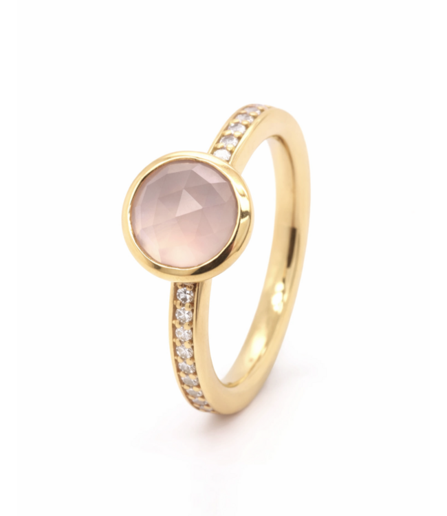 Elegante geelgouden ring ontworpen en gemaakt door onze goudsmid Bregje. De ring is gemaakt van 18kt geelgoud waardoor de ring zijn kleur behoudt. In het midden van de ring is een gefacetteerd geslepen Chalcedoon gezet. Daarnaast zijn aan de bovenzijde van de ring in de band briljant geslepen diamanten gezet (24x = 0.24ct TW VS). De maat van de ring is 54, maar kan in andere maten gemaakt worden. Voor meer informatie neem dan gerust contact met ons op!