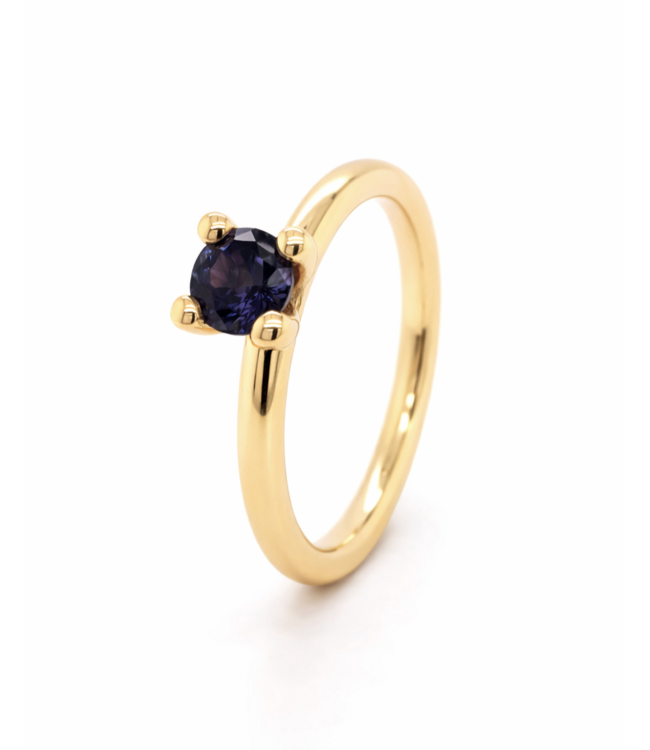 Schitterende geelgouden ring met solitair zetting, ontworpen en met liefde gemaakt door onze eigen goudsmid Bregje. De ring, genaamd Lily, heeft een breedte van 3mm en schittert met een natuurlijke paarse Spinel van 6mm, 0.96ct. Deze unieke creatie is uitgevoerd in 18K geelgoud. Met een ringmaat van 55 is deze Lily Mini een pronkstuk, maar geen zorgen: alle ROEMER by Bregje ringen kunnen volledig op maat gemaakt worden.
