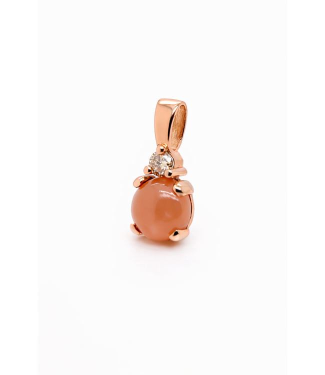 18K Roségouden hanger met oranje maansteen en congnac diamant, bekijk deze hanger online of kom langs bij ons in de winkel om deze eigen gemaakte sieraden te bewonderen. deze hanger behoort tot de Solance collectie.