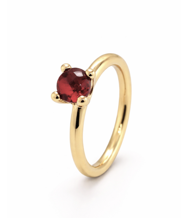 Schitterende geelgouden ring met solitair zetting, ontworpen en met liefde gemaakt door onze eigen goudsmid Bregje. De ring, genaamd Lily, heeft een breedte van 3mm en schittert met een Buff top geslepen rode granaatl van 6mm. Deze unieke creatie is uitgevoerd in 18K geelgoud. Met een ringmaat van 53 is deze Lily een pronkstuk, maar geen zorgen: alle ROEMER by Bregje ringen kunnen volledig op maat gemaakt worden.