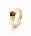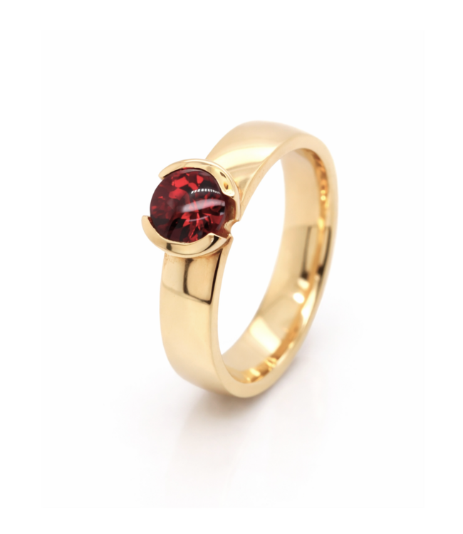 Prachtige geelgouden ring ontworpen en gemaakt door onze goudsmid Bregje. De ring is gemaakt van 18kt geelgoud waardoor deze mooi van kleur blijft. In het midden van de ring is een mooie dieprode Granaat gezet die Buff-top geslepen is. Dit betekent dat de Granaat aan de bovenzijde cabochon geslepen is, en aan de onderzijde gefacetteerd is. De maat van de ring is 55, maar kan op maat gemaakt worden. Voor meer informatie neem dan gerust contact met ons op!