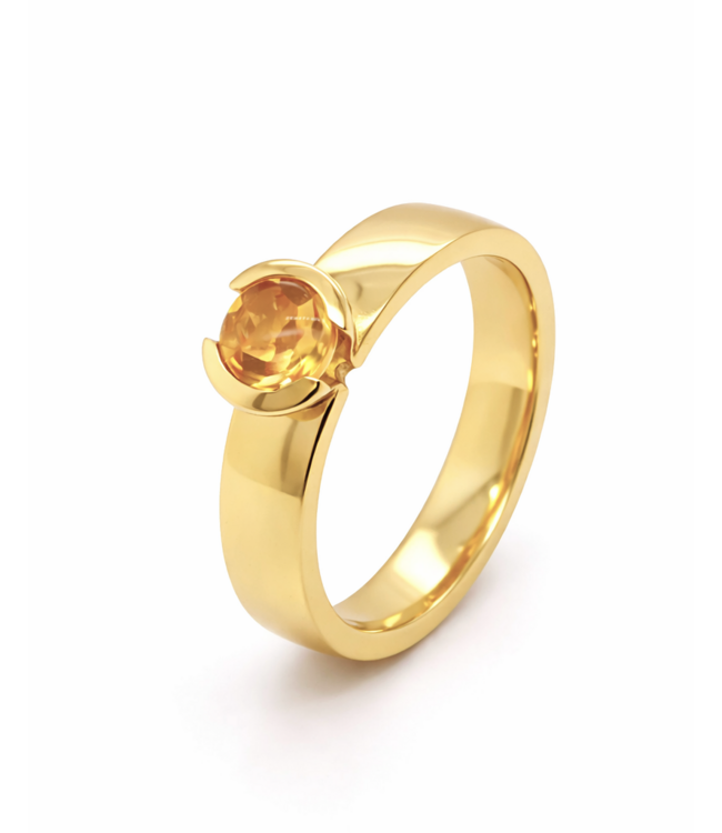 Prachtige geelgouden ring ontworpen en gemaakt door onze goudsmid Bregje. De ring is gemaakt van 18kt geelgoud waardoor deze mooi van kleur blijft. In het midden van de ring is een mooie Citrien gezet die Buff-top geslepen is. Dit betekent dat de topaas aan de bovenzijde cabochon geslepen is, en aan de onderzijde gefacetteerd is. De maat van de ring is 53, maar kan op maat gemaakt worden. Voor meer informatie neem dan gerust contact met ons op!
