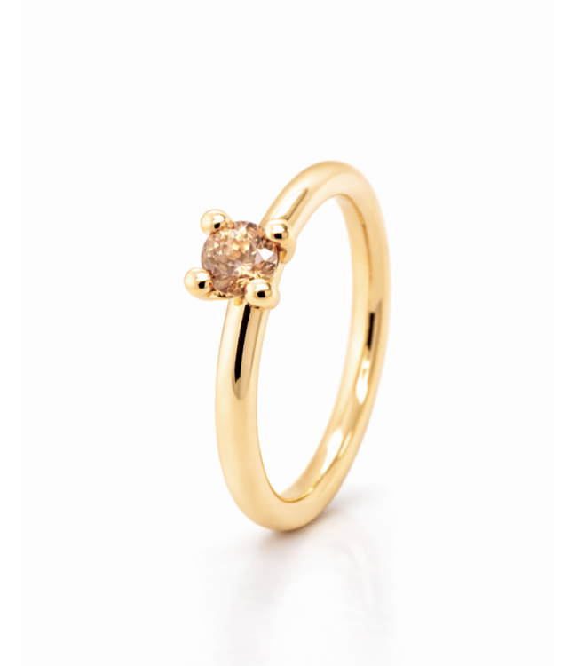 Schitterende geelgouden ring met solitair zetting, ontworpen en met liefde gemaakt door onze eigen goudsmid Bregje. De ring, genaamd Lily, heeft een breedte van 3mm en schittert met een natuurlijke oranje zirkoon van 5.5mm. Deze unieke creatie is uitgevoerd in 18Kgeelgoud. Met een ringmaat van 57 is deze Lily een pronkstuk, maar geen zorgen: alle ROEMER by Bregje ringen kunnen volledig op maat gemaakt worden.