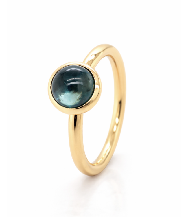 Stijlvolle geelgouden ring, ontworpen en met de hand vervaardigd door onze eigen goudsmid, Bregje. Deze ring, genaamd Single Bubble, heeft een breedte van 3mm en bevat een cabochon geslepen London Blue Topaas van 9mm in een ronde, gladde zetting. Gemaakt van 18K geelgoud, biedt deze ring een subtiele, maar opvallende uitstraling. Met een ringmaat van 58 is dit een prachtig sieraad, en natuurlijk kunnen alle ROEMER by Bregje ringen op maat worden gemaakt.