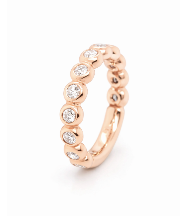Tijdloze roségouden ring gemaakt door onze goudsmid Bregje. Zij heeft de ring gemaakt van 18kt roségoud, waardoor de ring mooi zijn kleur behoudt. Zij heeft 15 bolletjes op de ring gemaakt waarin een briljant geslepen diamant zit die prachtig zullen schitteren in het licht (12x = 0.72ct TW VS). De ring kan enkel gedragen worden, maar kan ook zeker gestapeld worden met andere ringen. De maat van de ring is 52, maar kan op iedere maat worden gemaakt.