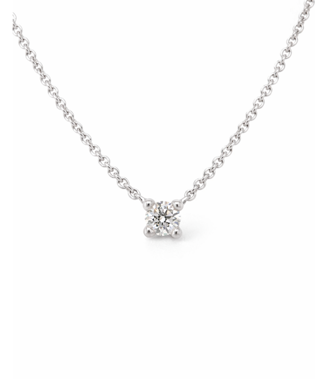 Schitterende witgouden collier met solitair, ontworpen en met liefde gemaakt door onze eigen goudsmid Bregje. Het collier schittert met een natuurlijke diamant van 0.64ct. Deze unieke creatie is uitgevoerd in 14K witgoud.