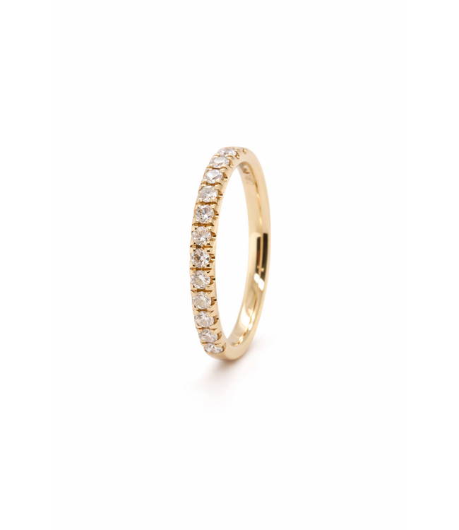 Elegante geelgouden ring. De ring is gemaakt van 18kt geelgoud en aan de bovenzijde bezet met briljant geslepen diamanten die prachtig schitteren in het licht. De maat van de ring is 51, maar kan in andere maten besteld worden. De ring kan mooi enkel gedragen worden, maar kan ook gestapeld gedragen worden met andere ringen. Voor meer informatie neem dan gerust contact met ons op!