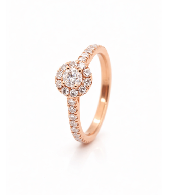Schitterende rosegouden ring met natuurlijke diamant briljant geslepen 0.68ctTW Si, middensteen 4mm. Perfect om los te dragen, maar er kan ook een zijring naast gedragen worden, omdat de zetting hoger is. Ook geweldig als bijzondere verlovingsring. Maat 51