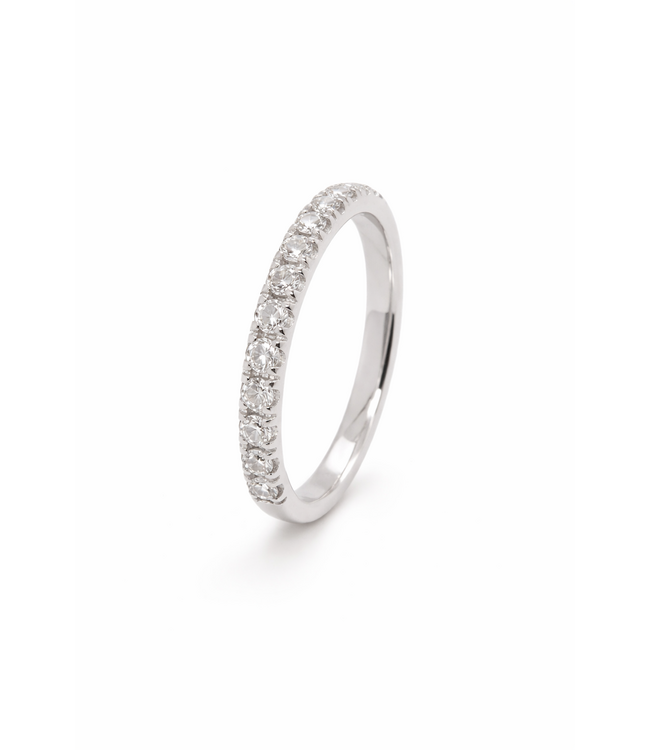 Elegante witgouden ring. De ring is gemaakt van 18kt witgoud en aan de bovenzijde bezet met briljant geslepen diamanten die prachtig schitteren in het licht. De maat van de ring is 53, maar kan in andere maten besteld worden. De breedte van de ring is 2,1 mm. De ring kan mooi enkel gedragen worden, maar kan ook gestapeld gedragen worden met andere ringen. Voor meer informatie neem dan gerust contact met ons op!
