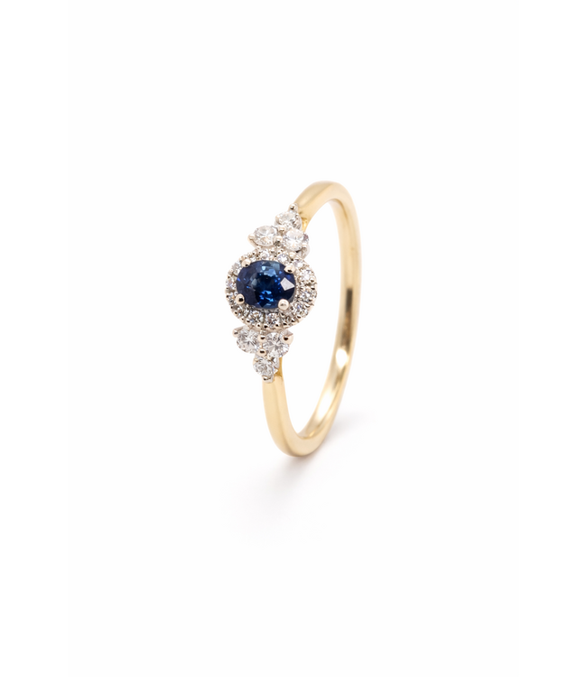 Prachtige geelgouden ring met saffier en diamanten. De ring is gemaakt van 14kt geelgoud, hierdoor zal de ring mooi haar kleur behouden. In het midden van de ring is een mooi diepblauwe saffier gezet met daaromheen briljant geslepen diamanten (0.38ct.). De maat van de ring is 52, maar kan in andere maten besteld worden. Voor meer informatie neem dan gerust contact met ons op!