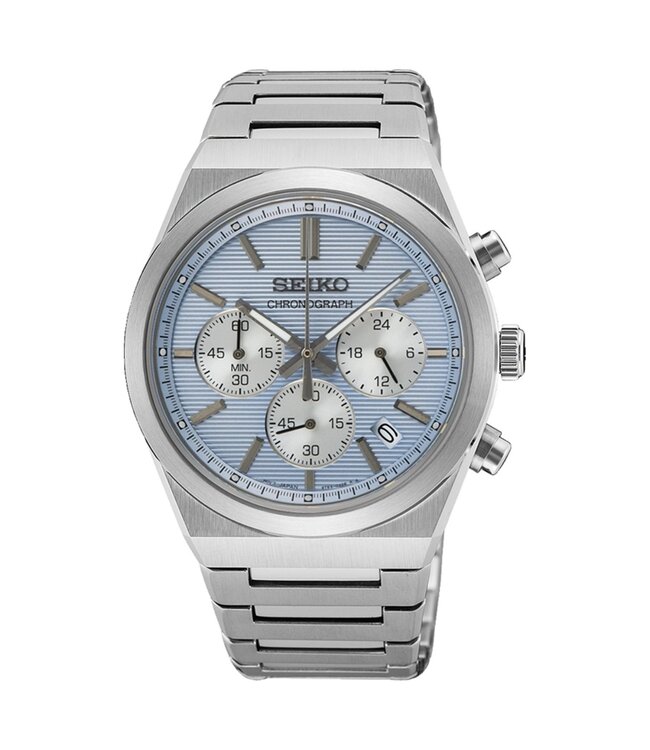 De Seiko SSB459P1 Chronograaf voor heren combineert sportieve functionaliteit met een frisse, moderne uitstraling. De roestvrijstalen kast en stalen schakelband zorgen voor een stevige en stijlvolle basis, terwijl de lichtblauwe wijzerplaat het horloge een opvallend en eigentijds karakter geeft. Dit model is uitgerust met een betrouwbaar quartz-uurwerk, kaliber 8T63, en beschikt over een chronograaf, datumweergave, 24-uurs aanduiding en kleine seconde. De stopwatch meet tot 60 minuten in stappen van 1/5 seconde, waardoor het horloge zowel praktisch als nauwkeurig is in gebruik. Het saffierglas biedt extra krasbestendigheid en met een waterbestendigheid van 10 bar is de Seiko SSB459P1 uitstekend geschikt voor dagelijks gebruik.