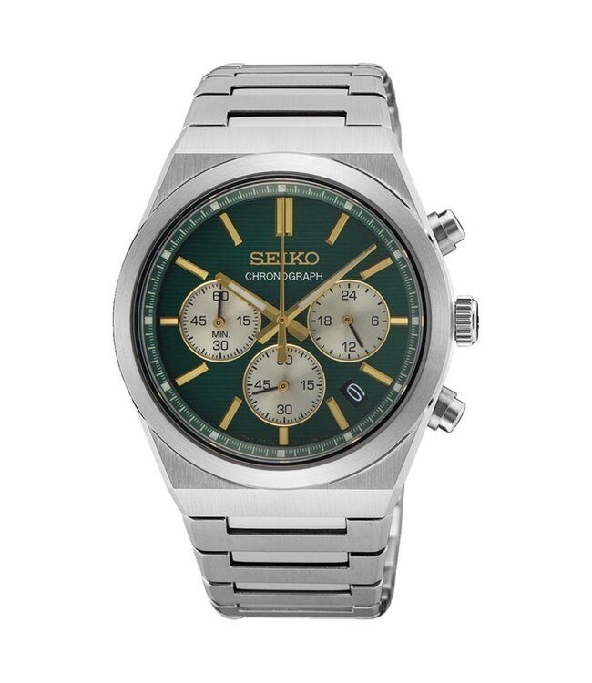 De Seiko SSB461P1 Chronograaf voor heren combineert sportieve functionaliteit met een moderne en verzorgde uitstraling. De roestvrijstalen kast en stalen schakelband zorgen voor een stevige en stijlvolle basis, terwijl de groene wijzerplaat het horloge een opvallend en eigentijds karakter geeft. Dit model is uitgerust met een betrouwbaar quartz-uurwerk, kaliber 8T63, en beschikt over een chronograaf, datumweergave, 24-uurs aanduiding en kleine seconde. De stopwatch meet tot 60 minuten in stappen van 1/5 seconde, wat dit horloge praktisch maakt voor dagelijks gebruik. Dankzij het saffierglas en de waterbestendigheid van 10 bar is de Seiko SSB461P1 een duurzame en veelzijdige keuze voor de moderne man.