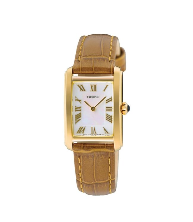 De Seiko SWR100P1 is een elegant dameshorloge met een klassieke en verfijnde uitstraling. De goudkleurige rechthoekige kast geeft dit model een stijlvolle en tijdloze look, terwijl de parelmoer wijzerplaat en bruine leren band zorgen voor een luxe en vrouwelijke afwerking. Dit horloge is uitgerust met een betrouwbaar quartz-uurwerk, kaliber 4N30, en biedt nauwkeurige tijdweergave in het dagelijks gebruik. Het gebogen Hardlex glas versterkt de elegante uitstraling van het ontwerp, terwijl de waterbestendigheid van 5 bar extra gebruiksgemak biedt. De Seiko SWR100P1 is daarmee een prachtige keuze voor vrouwen die houden van een klassiek horloge met een chique uitstraling.