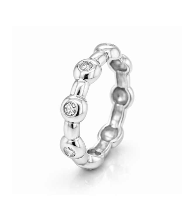 Unieke ring ontworpen en gemaakt door onze goudsmid Bregje. Zij heeft de ring gemaakt van 14kt witgoud. De ring bestaat uit meerdere bolletjes waartussen een balkje is gezet die de bolletjes met elkaar verbindt. In 4 bolletjes is een briljant geslepen diamant gezet. De maat van de ring is 55/17.50, maar kan op maat gemaakt worden. Voor meer informatie neem dan gerust contact met ons op!