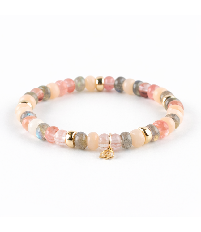 Grijs en roze; Een perfecte combinatie. De verschillende tinten roze maken deze armband heel vrouwelijk. De prachtige labradoriet stenen geven deze armband een tijdloze en stoere touch.